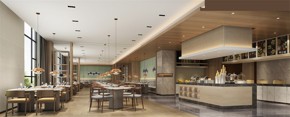 早餐厅地面铺设灰色大理石和浅色地板,墙壁是浅色和绿色壁布硬包,绿色壁布硬包上立体的装饰物极富层次感,令人印象深刻。白色的自助取餐台干净卫生,黑色大理石包边又把每个区域划分得井井有条。